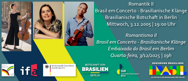 Berlin | 03.12.2025 | Vorweihnachtliches Konzert der DBG und der Brasilianischen Botschaft Liebe Mitglieder und Freunde der Deutsch-Brasilianischen Gesellschaft, wir freuen uns sehr, Sie - gemeinsam mit der brasilianischen Botschaft – zu einem vorweihnachtlichen Konzert am Mittwoch, den 3.12.2025 um 19 Uhr, in der Brasilianischen Botschaft einladen zu können. Für Sie wird das BrazilianTrio mit den Solisten Sarah Gait (Cello), […]